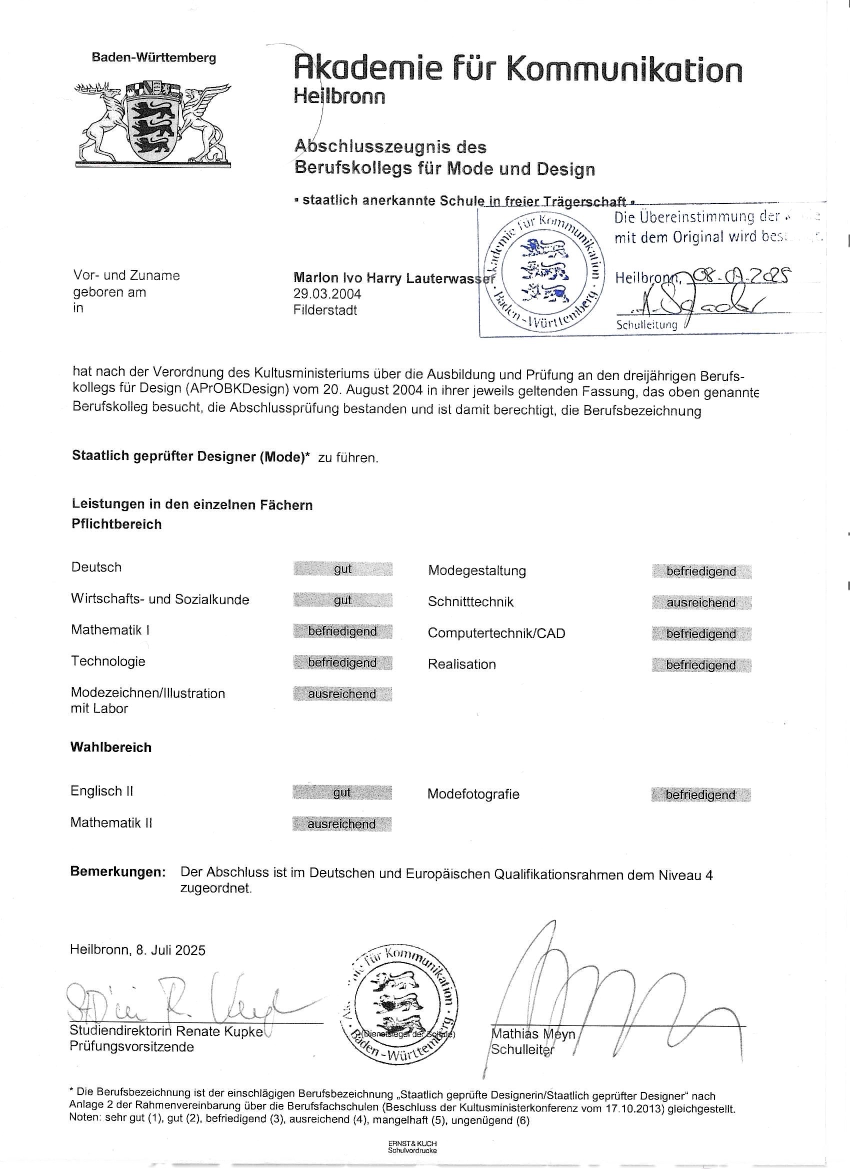 - Fachhochschulreife and State Examined Designer (Fashion)