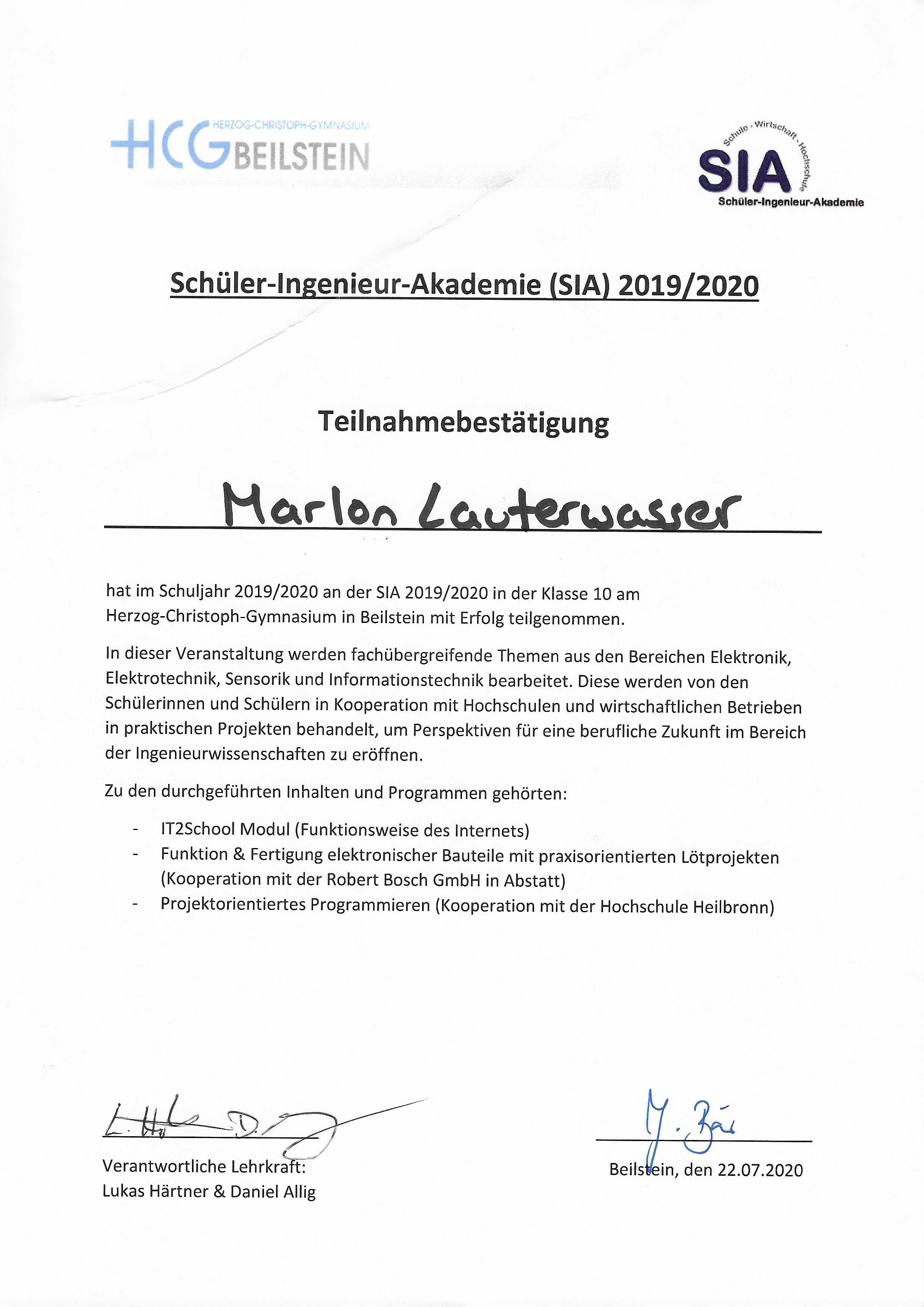 SIA - Schüler Ingieneurs Akademie 2020 – 2021
